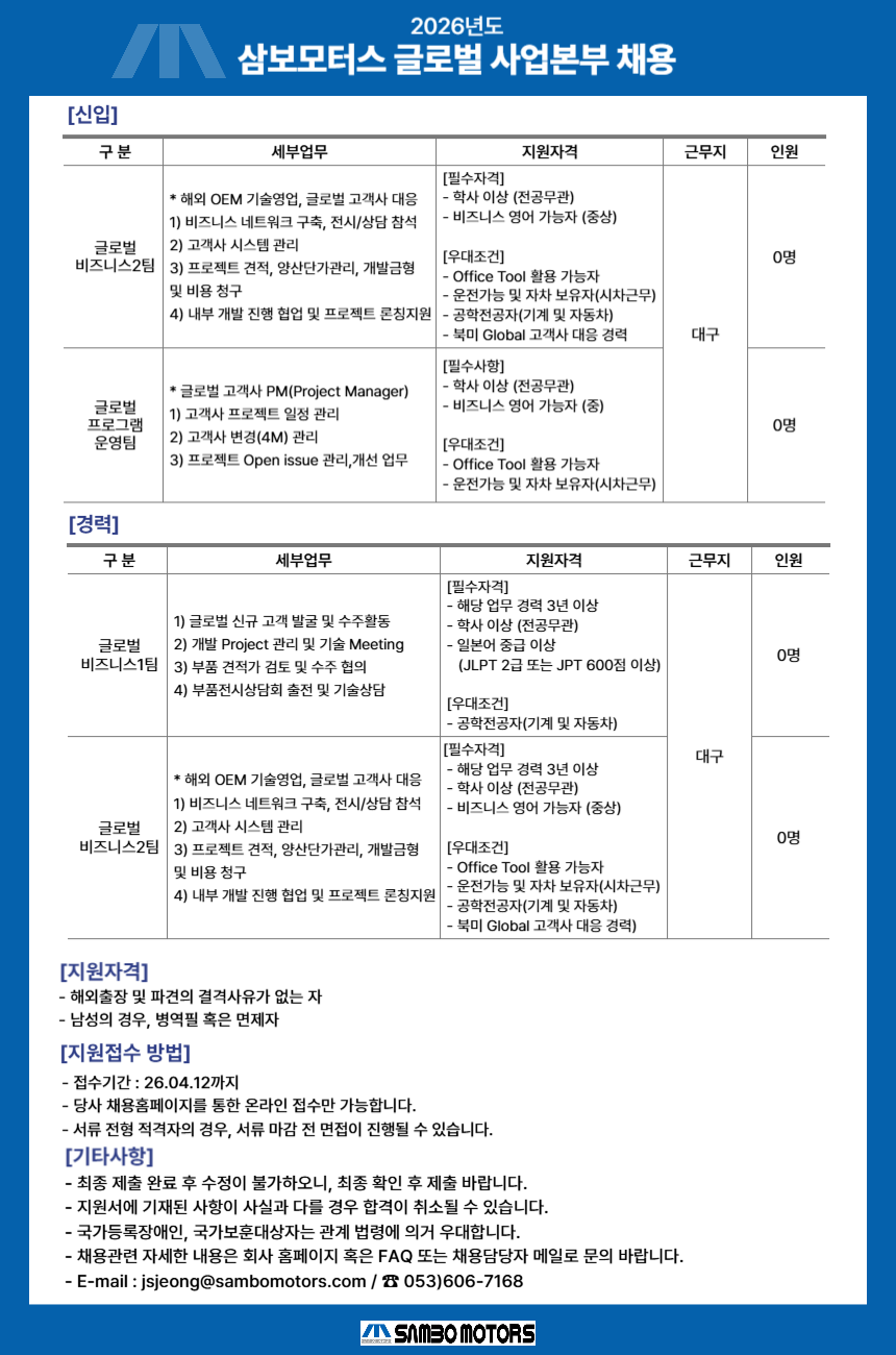 [삼보모터스] ~4/12 ( 글로벌프로그램운영(PM,), 코스닥 1.6조)